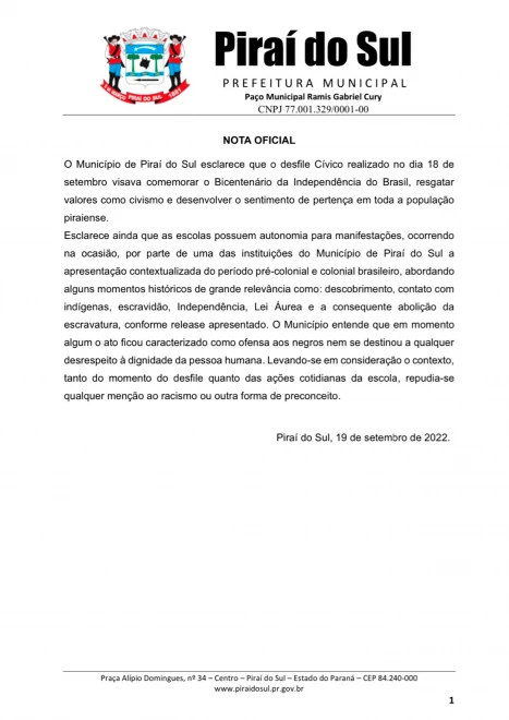 Segundo o documento, as escolas possuem autonomia para desenvolver as manifestações apresentadas durante o desfile e que, na ocasião, uma das instituições do Município realizou uma “apresentação contextualizada do período pré-colonial e colonial brasileiro, abordando alguns do momentos históricos de grande relevância, como descobrimento, contato com indígenas, escravidão, Independência, Lei Áurea e a abolição da escravatura”. O órgão ainda repudia qualquer menção ao racismo ou outra forma de preconceito.