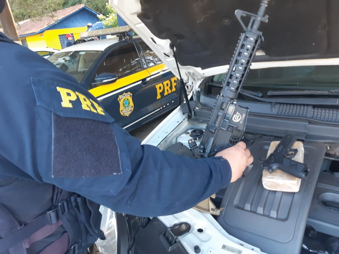 Na abordagem, a PRF constatou que se tratava de policial militar, de 39 anos, e um primo dele, de 40 anos. Durante a fiscalização, foram localizados em um compartimento oculto do veículo: