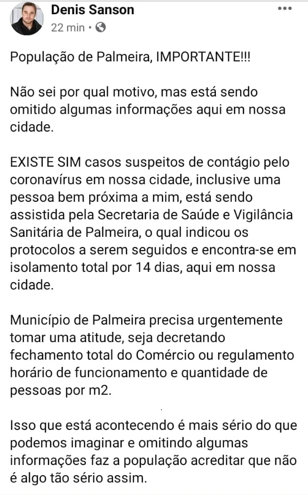 Mais cedo, a Secretária de Saúde de Palmeira, Fabiani Ramos Bach Czelusniak se pronunciou sobre o assunto na internet em uma nota oficial.