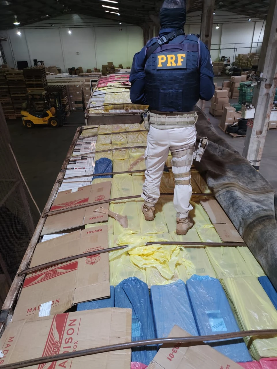 Por volta das 5h, em Quarto Centenário (PR), uma equipe da PRF apreendeu 600 mil maços de cigarros contrabandeados num bitrem com placas trocadas. Um homem, de 30 anos, foi preso por contrabando.