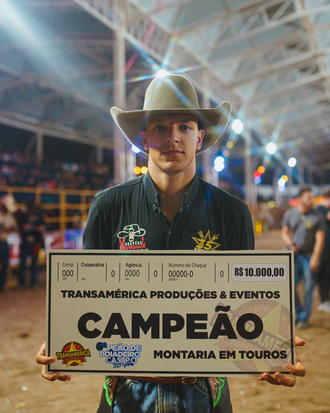 É de Ouro Verde do Oeste (PR) o peão vencedor da principal prova de rodeio da 6ª Festa do Peão de Boiadeiro de Castro. Cristoffer Augusto Aguiar fechou a competição com 332 pontos e emocionou o público na última disputa, contra o touro S.O.S. O campeão levou pra casa o prêmio principal, de R$ 10 mil, mais R$ 2 mil do Projeto Country Life, ação apadrinhada pelo cantor Pedro Paulo, da dupla Pedro Paulo & Alex. Mais de 100 atletas disputaram as provas de Montaria em Touros, Team Roping (conhecido como laço em dupla) e Três Tambores durante os quatro dias do evento (de 19 a 22), na arena coberta montada no Parque de Exposições Dario Macedo. A premiação total foi de R$ 62 mil.