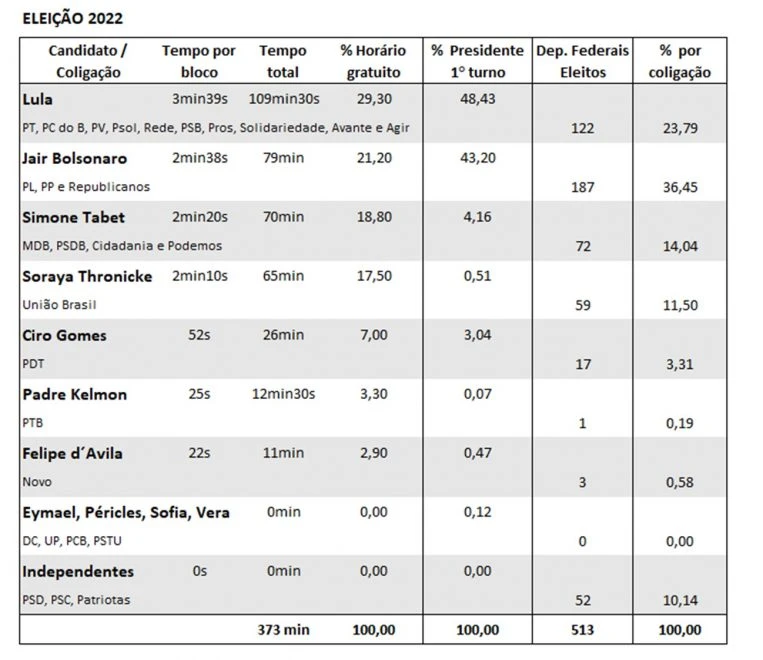 O percentual de tempo gratuito concedido a cada registro de candidatura manteve uma relação de proporcionalidade com o resultado da eleição, ou seja, o candidato Lula, que tinha o maior tempo no horário eleitoral, venceu a eleição do segundo colocado, que tinha o segundo maior tempo.