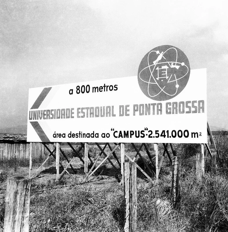 Placa sinaliza a construção do novo Campus no Uvaranas em 1980 | Ponta Grossa Histórica / Reprodução[/caption]