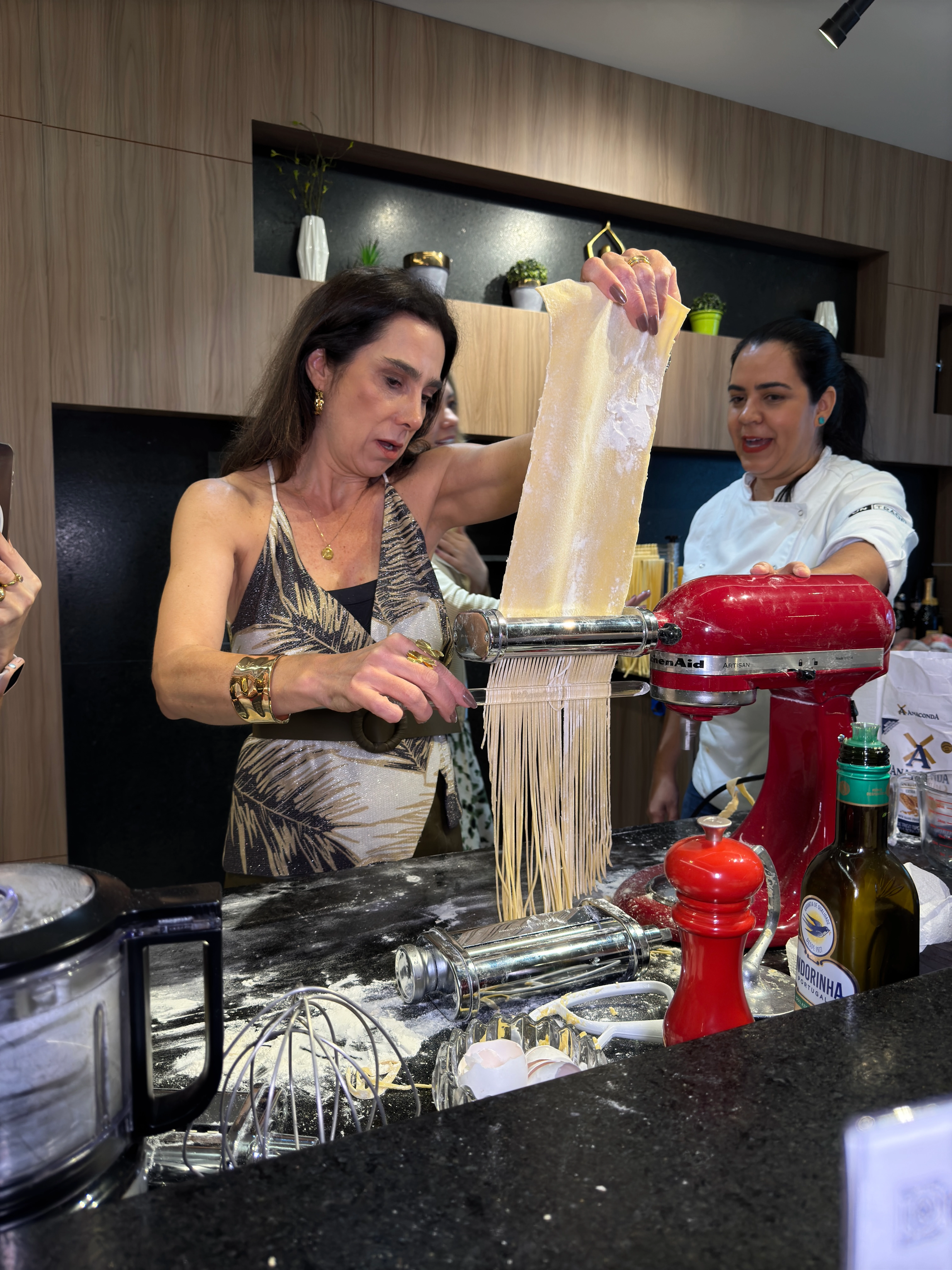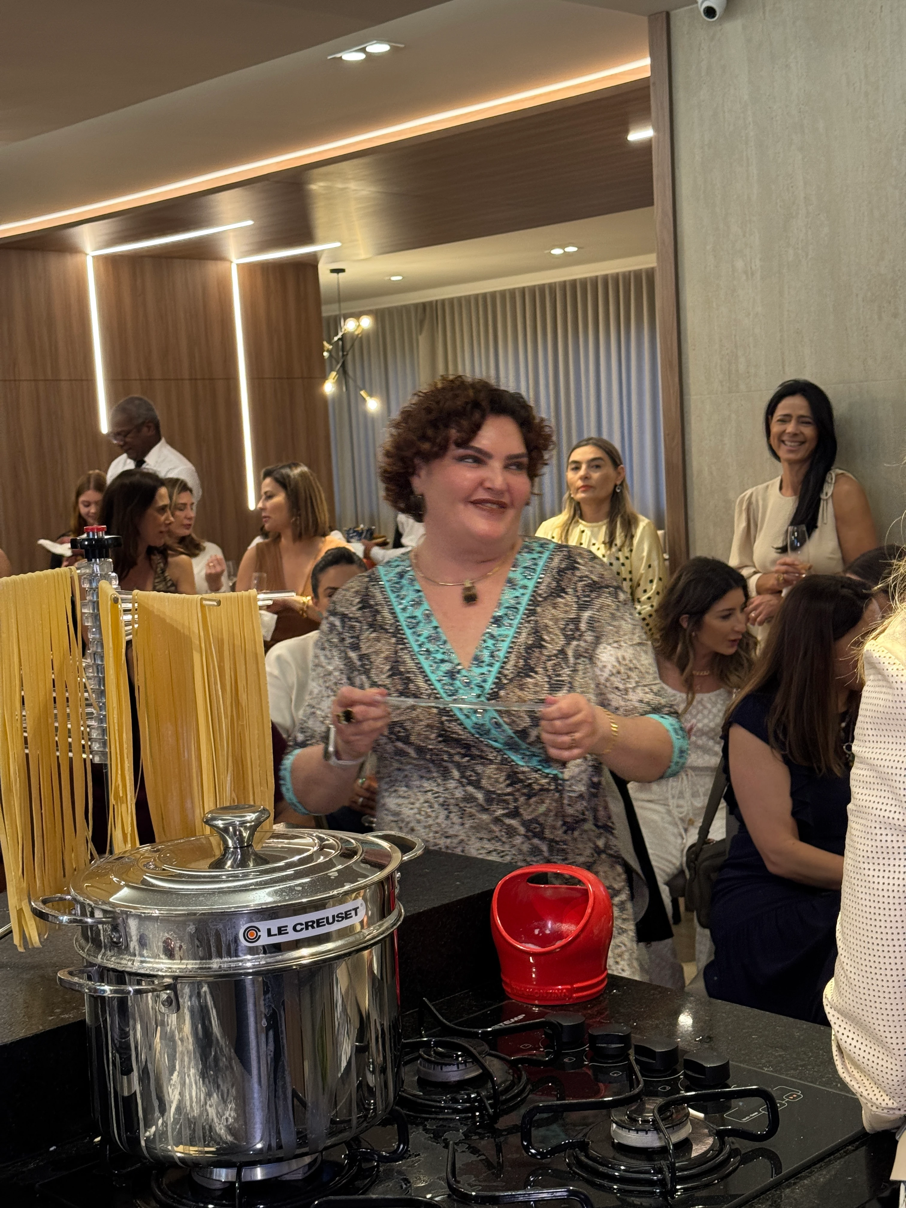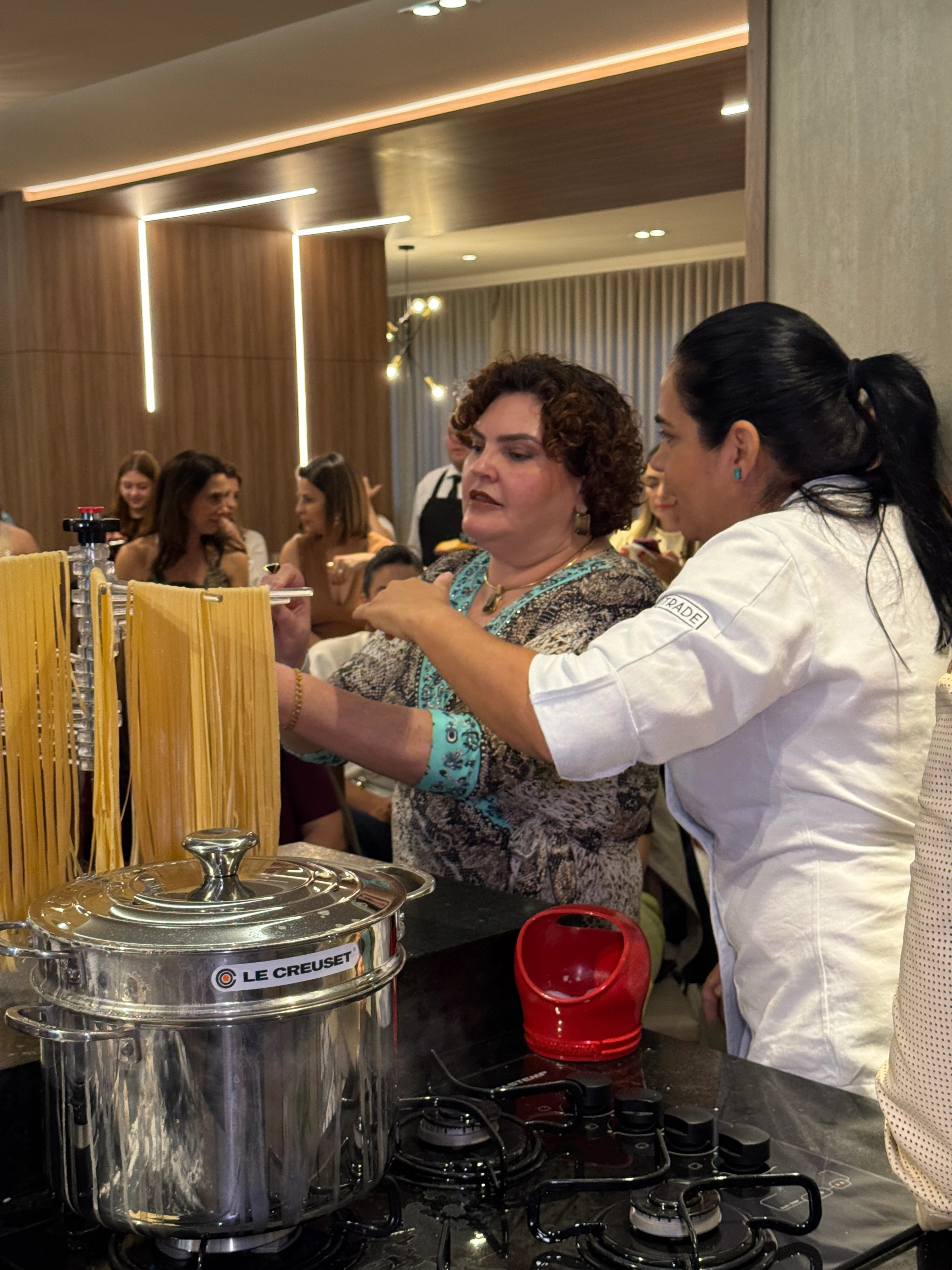 Com mãos na massa e muita animação, as convidadas colocaram em prática os ensinamentos, colaborando para preparar uma deliciosa receita de massa fresca que encantou a todos. O ambiente foi enriquecido pelos sabores dos vinhos da Bentevino, que harmonizaram perfeitamente com o clima descontraído, e pelos lindos arranjos florais da Bohemian Home Floral (