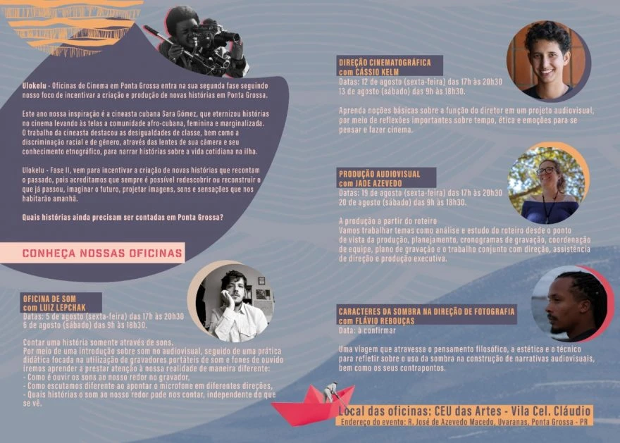 Entre o dia 5 de agosto a 24 de setembro acontecem as aulas da 2ª fase do projeto Ulokelu Oficinas de Cinema de Ponta Grossa. Desta vez o projeto se dará de forma presencial, no CEU das Artes, na Vila Coronel Cláudio, em Uvaranas e para participar, basta ter interesse em aprender cinema e ideias para contar boas histórias sobre nossa cidade. As inscrições são gratuitas e podem ser feitas no site