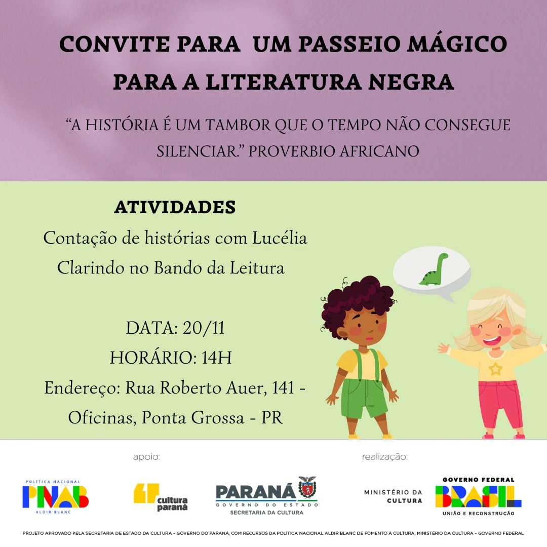 As atividades serão conduzidas pela contadora de histórias Lucélia Clarindo, que tem percorrido diferentes instituições públicas de Ponta Grossa, levando narrativas de autores negros, memória afetiva e práticas manuais para estudantes e grupos sociais. As contrapartidas já passaram por escolas como o Jesus Divino Operário, CEBEJA, pela instituição Aflorescer, além de ações junto ao CREAS, fortalecendo o acesso à leitura e ao diálogo sobre identidade e diversidade.