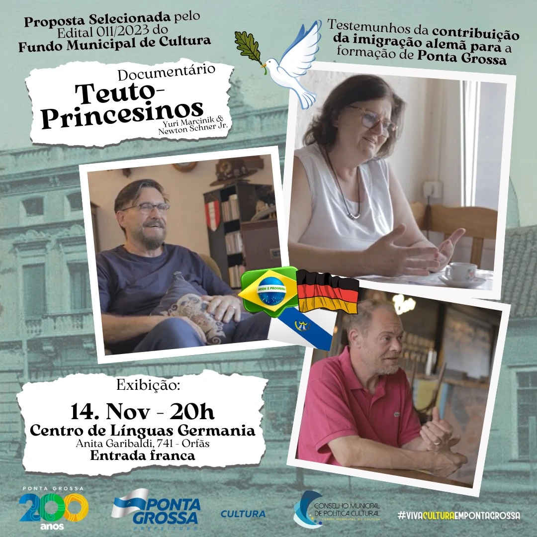 O documentário, produzido pelo professor juntamente com Yuri Marcinik, terá sua primeira exibição nesta terça-feira (14), no Centro de Línguas Germania, às 20h, e tem entrada gratuita. O conteúdo traz "testemunhos das contribuições da imigração alemã para a formação de Ponta Grossa", segundo Newton, e conta a história de três famílias de origem alemã, naturalizadas no município. A ideia, de acordo com o professor, é "não deixar passar em vão a presença de uma comunidade tão forte, que ajudou a criar tantas coisas em Ponta Grossa e na região", declara.