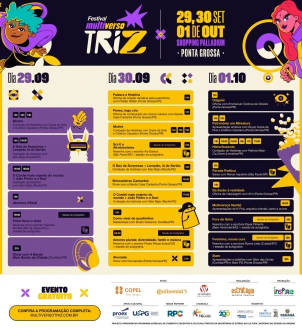 O tão aguardado Festival Multiverso TriZ, um dos maiores eventos projetados especialmente para crianças e adolescentes do Paraná, lançou oficialmente a programação de três dias que promete agitar Ponta Grossa. O evento está sendo programado para ser um dos encontros mais significativos do Paraná, reunindo num só espaço arte, literatura, tecnologia e entretenimento, de 29 de setembro a 01 de outubro, no Centro de Convenções do Shopping Palladium, das 14h às 22h.