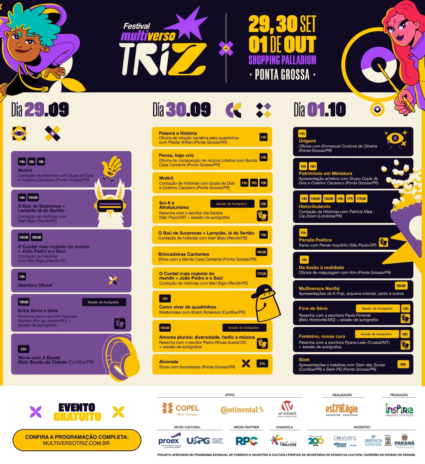 O Multiverso TriZ trará para Ponta Grossa alguns dos nomes mais importantes que estão conquistando jovens e crianças. Confirmaram presença autores de renome como Raphael Montes, Pedro Rhuas, Renan Inquérito, Ale Santos, Paula Pimenta, o ilustrador Ibraim Roberson, e música boa com a Banda Mais Bonita da Cidade.
