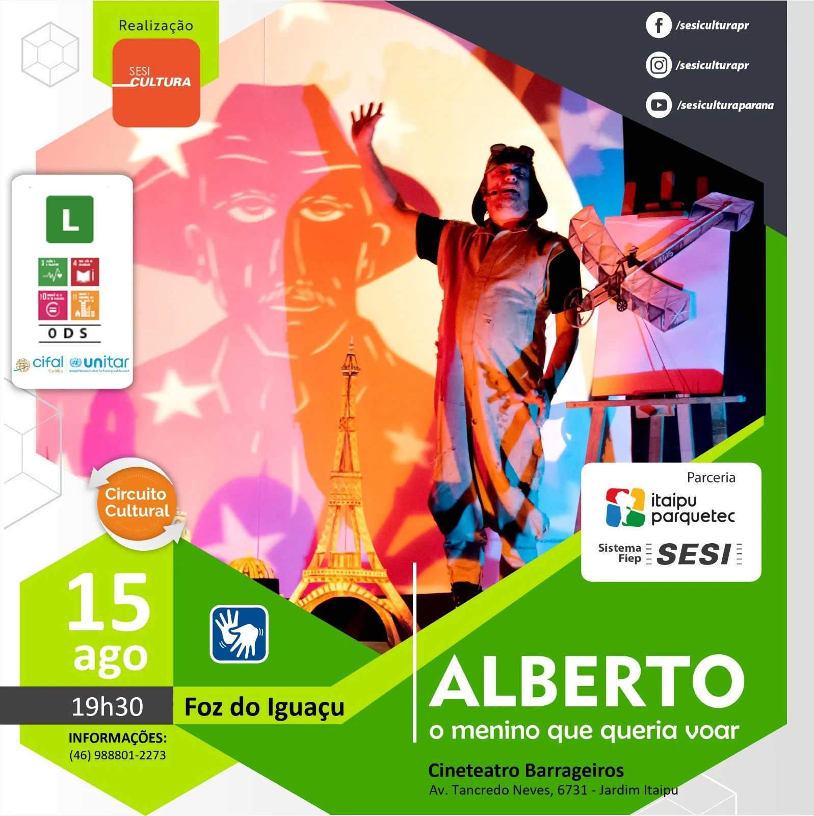 O espetáculo 'Alberto, o menino que queria voar' aterrissa em Foz do Iguaçu, no dia 15 de agosto, às 19h30, para uma apresentação especial do Circuito Cultural Sesi Paraná. Em parceria com o Itaipu Parquetec, a atração promete encantar espectadores de todas as idades, no Cineteatro dos Barrageiros.