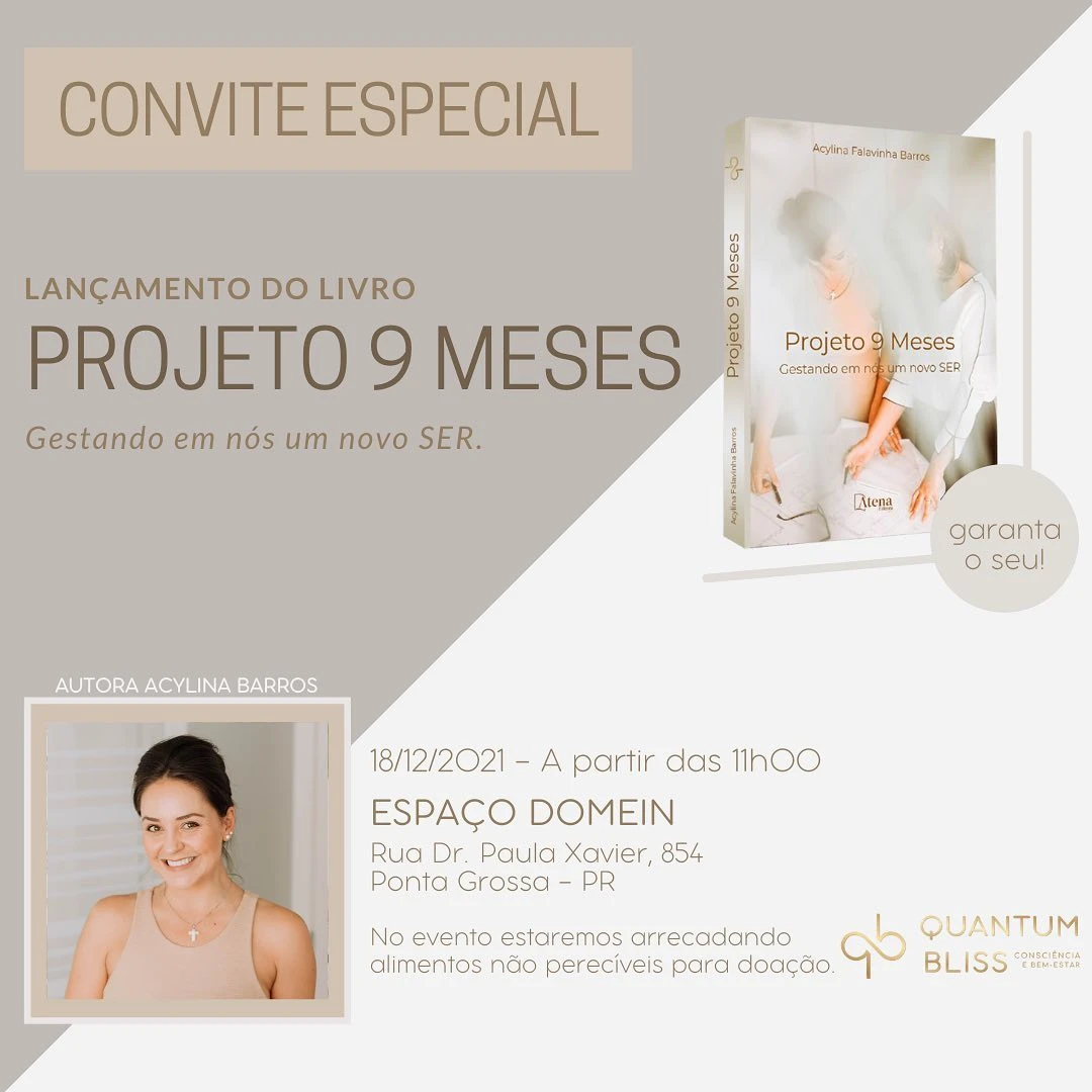 O lançamento do livro, produzido pela editora Atena e impresso pela gráfica Hellograf, acontece nesta sábado no Espaço Domein. Às 9h Acylina terá um momento particular com convidados e às 11h será aberto para o público geral, uma oportunidade para adquirir a obra e também saber mais sobre o Projeto 9 Meses e a autora, que está ansiosa por este momento.  "A sensação é de muita realização, um sonho muito grande sendo realizado. Faz três anos que eu estou gestando esse projeto e vendo ele nascer agora, nossa, meu coração transborda de gratidão,  de alegria, de