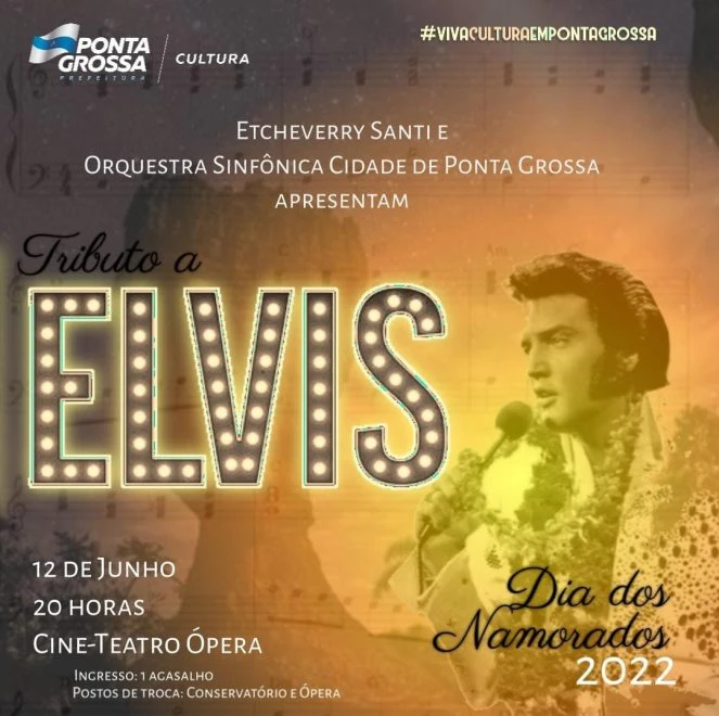 A Orquestra Sinfônica Cidade de Ponta Grossa (OSPG), com o músico Etcheverry Santi e sua banda realizam um tributo a Elvis Presley no próximo domingo (12), a partir das 20 horas, no Cine-Teatro Ópera. O concerto, em homenagem ao Dia dos Namorados, é promovido pela Prefeitura de Ponta Grossa, por meio da Secretaria Municipal de Cultura. Os ingressos deverão ser trocados por agasalhos, que serão destinados a entidades sociais.