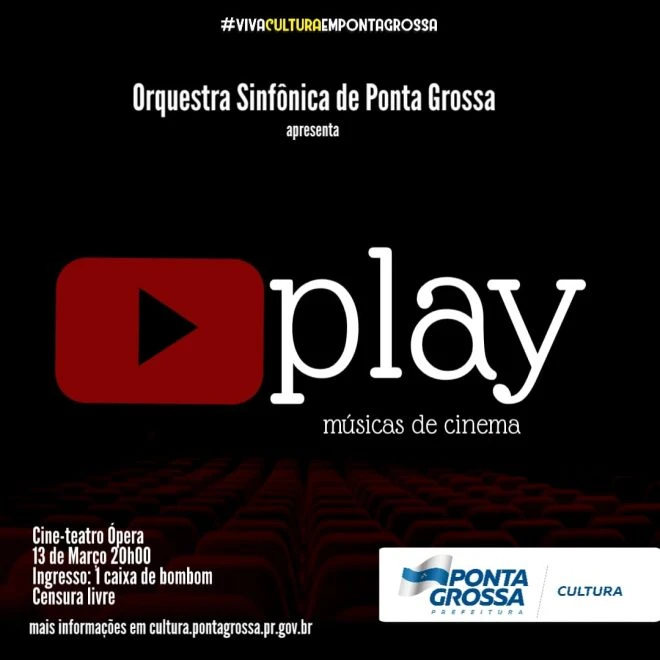 A Prefeitura de Ponta Grossa promove, neste domingo (13), o concerto ‘Play: Músicas de Cinema’ no Cine Teatro Ópera. O evento marca o início do calendário de apresentações da