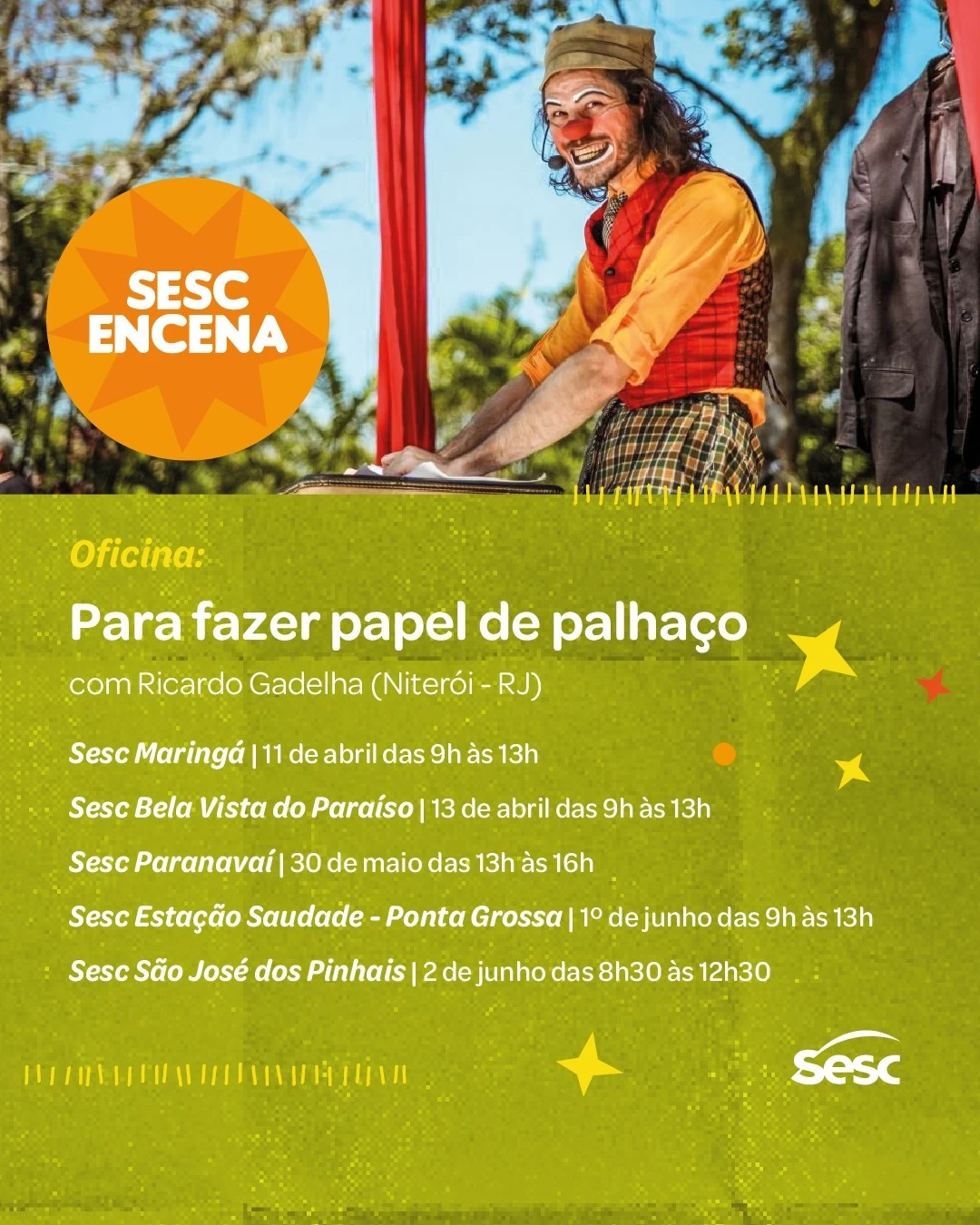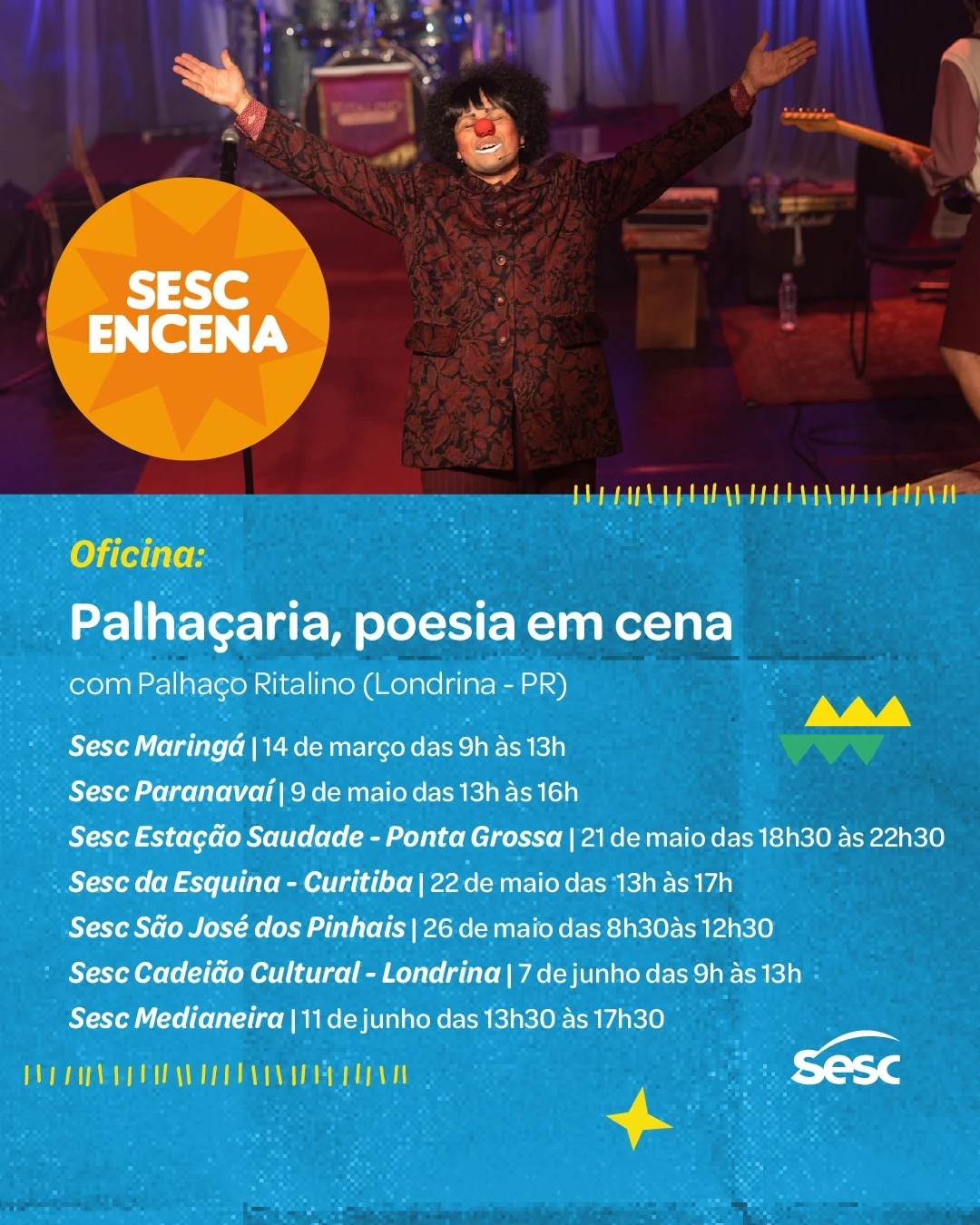 Ponta Grossa está entre as cidades contempladas pelo Sesc Encena, projeto que leva oficinas e espetáculos gratuitos de arte e cultura para diferentes regiões do Paraná. As atividades acontecem no Sesc Estação Saudade e são voltadas para todos os públicos, com classificação livre.