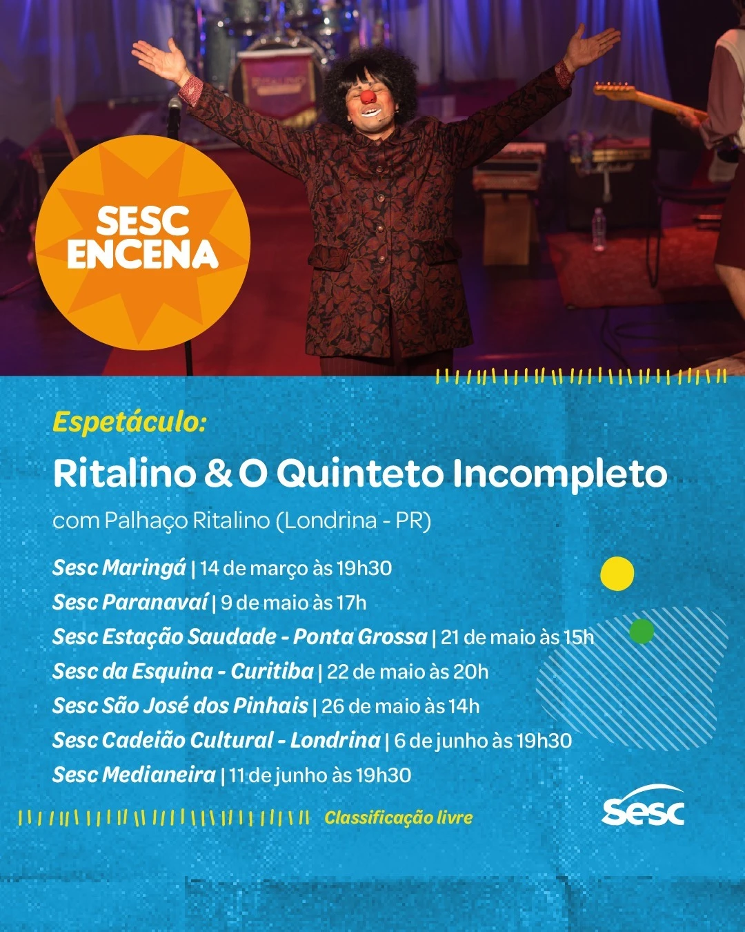 Espetáculo "Ritalino & O Quinteto Incompleto" Com Palhaço Ritalino (Londrina/PR) Data: 21 de maio, às 15h