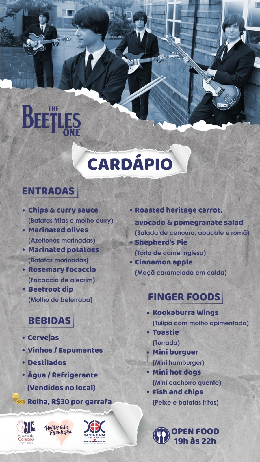 Open Food das 19h às 22h (comida típica de pub inglês).
