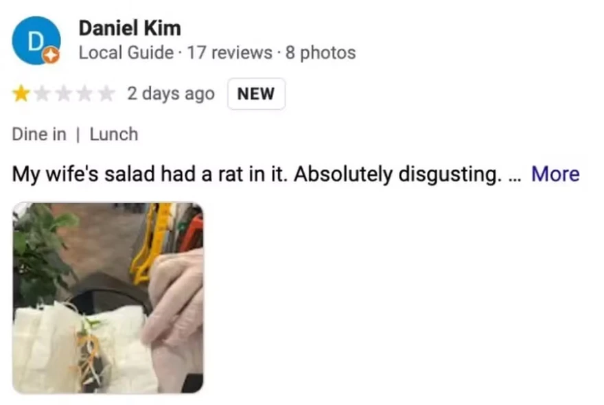 Daniel Kim, que se identificou como marido da cliente, também se manifestou: “A salada da minha esposa tinha um rato. Absolutamente nojento.”