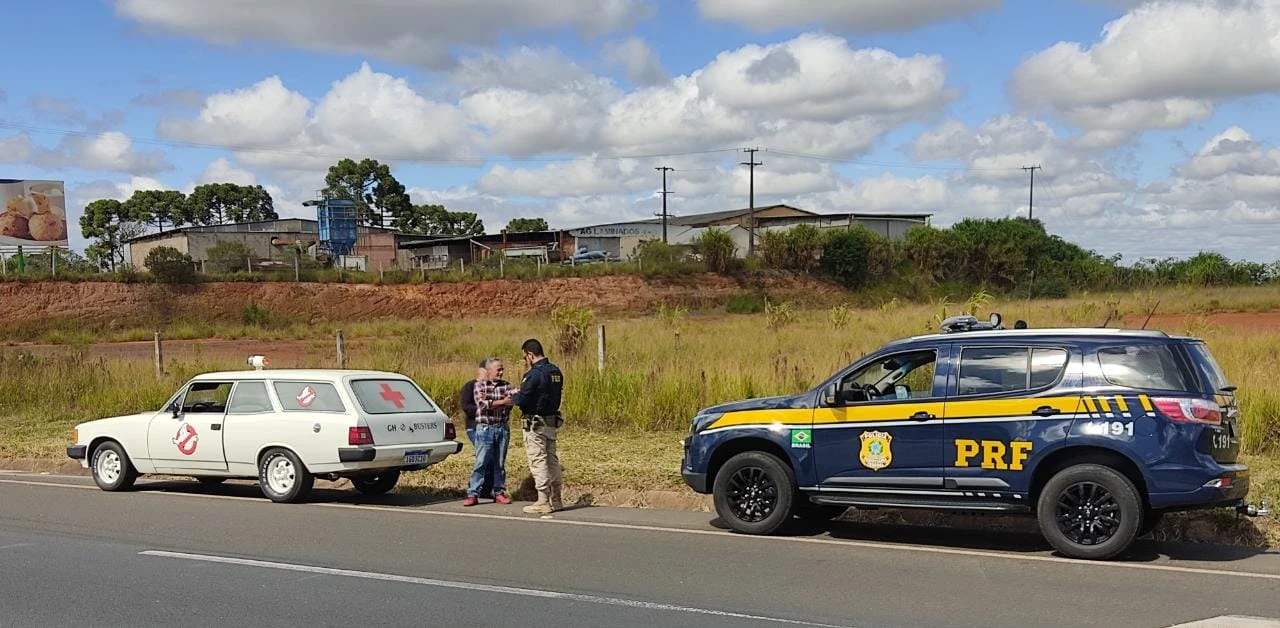 Uma "viatura Caça-Fantasmas", na verdade, um veículo customizado ao estilo do filme Ghostbusters (Caça-Fantasmas), chamou a atenção da Polícia Rodoviária Federal (PRF), em fiscalização na BR-376 durante a Operação Dia do Trabalhador, na tarde de sábado (29).