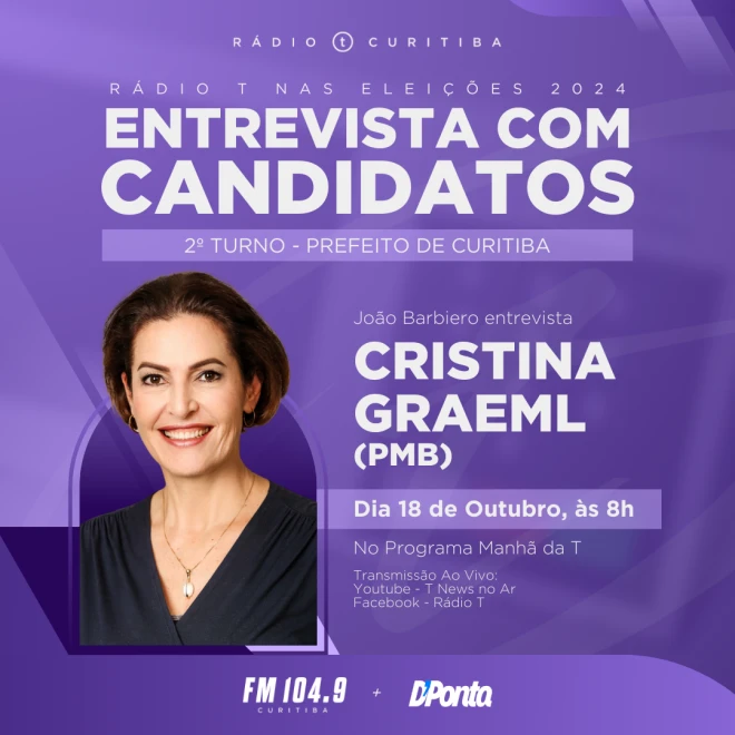 A candidata à Prefeitura de Curitiba, Cristina Graeml, será entrevistada nesta sexta-feira (18), em sabatina promovida pela Rádio T e o portal D'Ponta News. A conversa será conduzida pelo comunicador João Barbiero a partir das 8h e será transmitida ao vivo pelo rádio, redes sociais da T e também pelo portal.