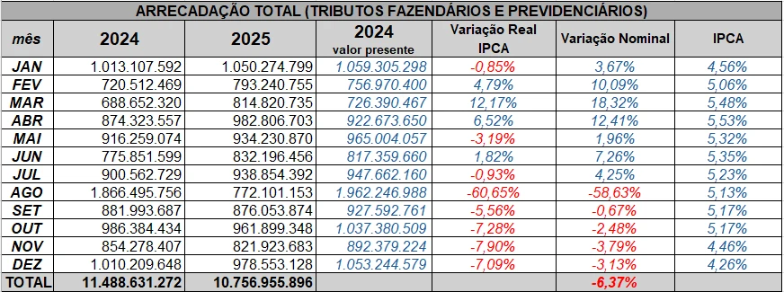 O valor total é, em termos nominais (sem considerar a inflação), 6,37% menor do que o registrado no período de janeiro a dezembro de 2024, quando a arrecadação alcançou o montante de R$11.488.631.272,00.