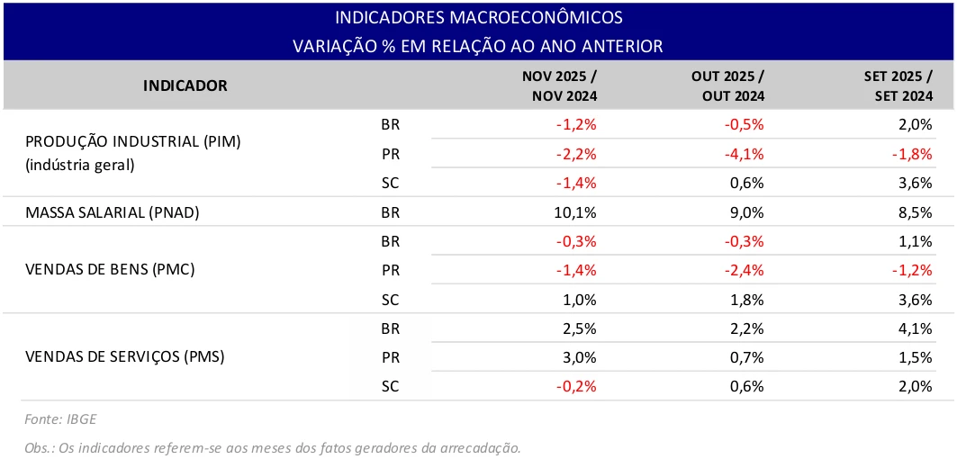 Entre os fatores que influenciaram a arrecadação do mês de dezembro de 2025 (comparação nominal com o mesmo mês do ano anterior), no âmbito da 9ª Região Fiscal (que congrega os estados do PR e de SC) e que também impactaram a região administrada pela DRF/Ponta Grossa, destacam-se: