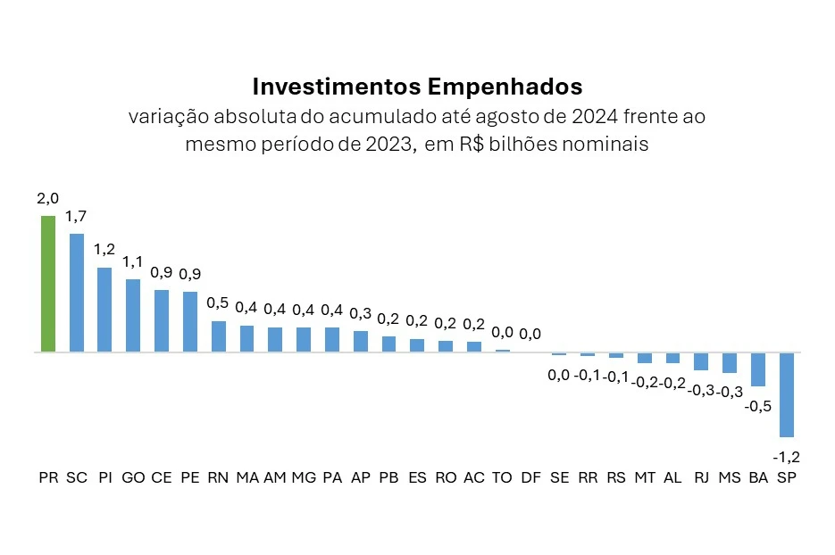 Esses R$ 2 bilhões chamam atenção porque apenas essa diferença é superior ao que a maior parte dos estados conseguiu investir nos primeiros oito meses de 2024. Das 27 unidades brasileiras, 13 empenharam menos de R$ 2 bilhões no período.