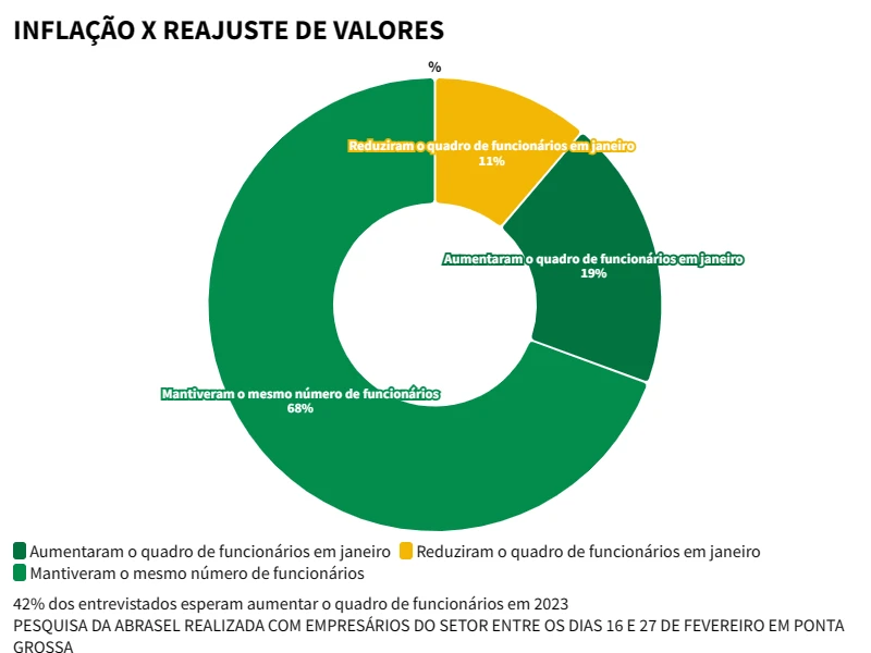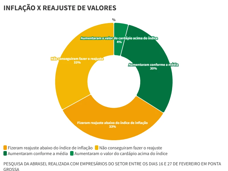 A pesquisa também mostrou que 33% dos empresários não conseguiram reajustar os preços baseados na inflação de 5,77% em 2022 e outros 33% só conseguiram ajustar com valores menores que o índice oficial. “Sabemos que precisamos corrigir nossos cardápios, mas é como um beco sem saída, pois podemos equilibrar o caixa, mas afastar os clientes, é uma situação delicada”, ressalta o presidente da Abrasel Campos Gerais.