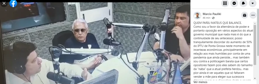 Como sou a favor da alternância de poder e portanto oposição em vários aspectos do atual governo municipal que nada mais é do que a continuidade de seu antecessor, posso tranquilamente discordar do aumento de 50% do IPTU de Ponta Grossa neste momento de incertezas econômicas ,principalmente em relação aos mais humildes por conta de uma pandemia que ainda persiste… mas também sou contra a politicagem barata que certos opositores fazem pois eles sabem do tamanho da “naba” que a atual prefeita herdou.. mas pior ainda é ver aqueles que só faltaram vender a mãe para eleger sua sucessora dizerem agora que discordam deste aumento. Típico que quem nunca assumiu seus BO,s e na primeira tempestade abandonam o barco. Na verdade tem método!