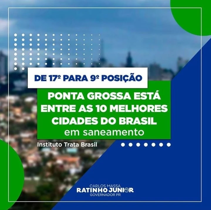 O prefeito Marcelo Rangel (PSDB) postou nesta sexta-feira (13), em seu perfil no Facebook, uma imagem segundo a qual Ponta Grossa figura entre as 10 melhores cidades do Brasil em questão de saneamento básico (conjunto de serviços, infraestruturas e instalações operacionais de abastecimento de água potável, esgotamento sanitário, limpeza urbana e manejo de resíduos sólidos, e drenagem e manejo das águas pluviais urbanas).