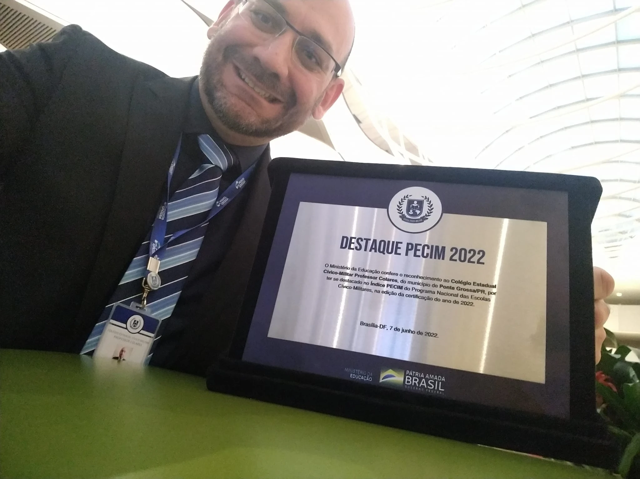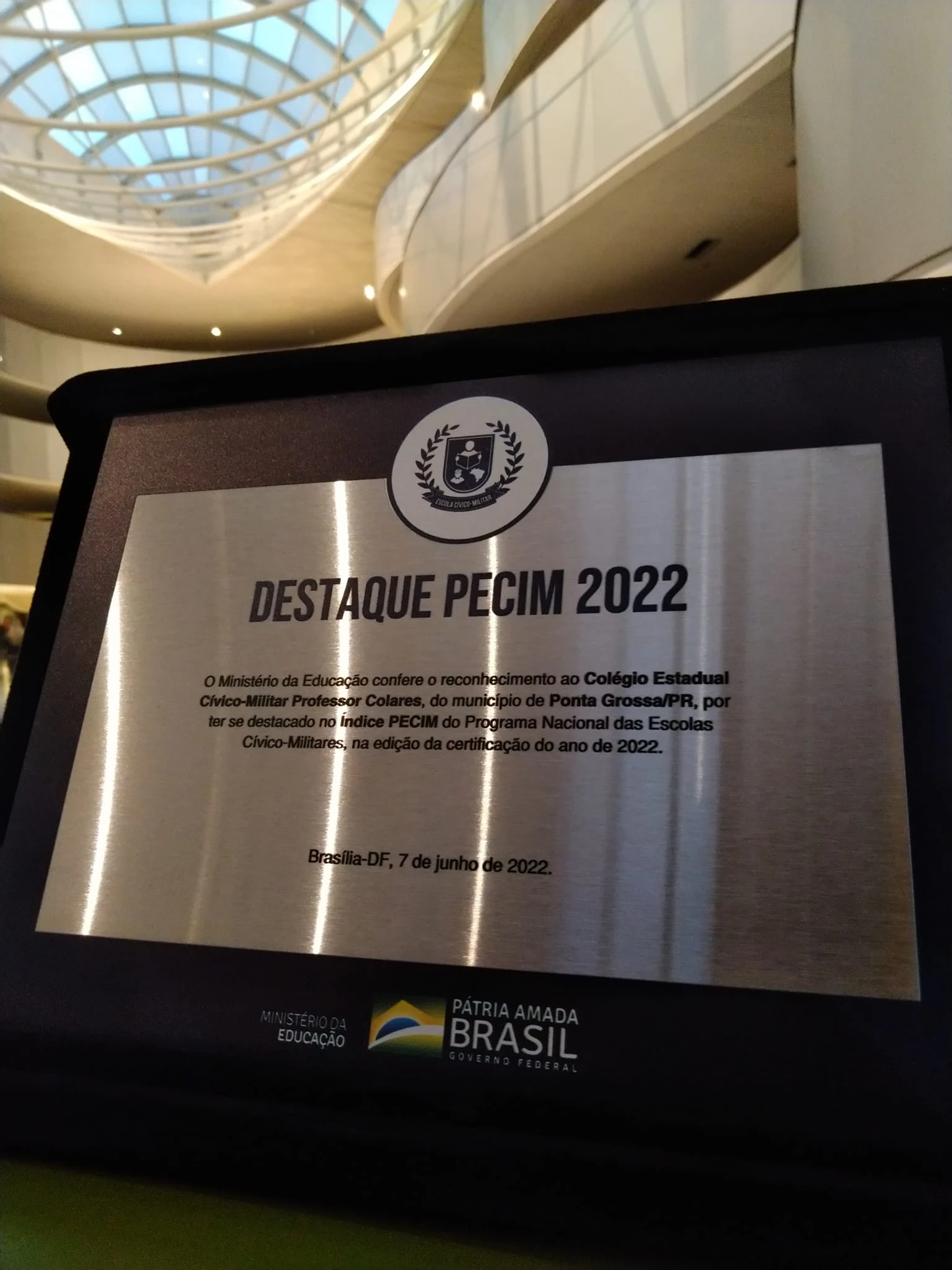 O Colégio Estadual Cívico-Militar Professor Colares, de Ponta Grossa, recebeu o reconhecimento de 'Colégio Destaque' no Programa Nacional das Escolas Cívico-Militares (PECIM) a nível nacional, em um evento realizado no Hotel Royal Tulip Alvorada, em Brasília, nesta terça-feira (7).
