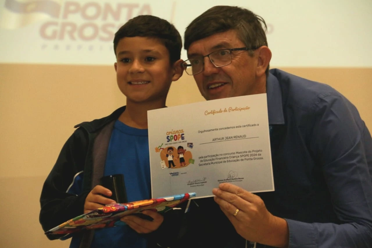 Estudantes da rede municipal de ensino de Ponta Grossa estão participando do projeto 'Criança SPOPE: Sonha, Planeja, Organiza, Poupa e Empreende'. O programa foi criado para fortalecer os conhecimentos dos alunos sobre educação financeira e fiscal. Nesta semana, a prefeita Elizabeth Schmidt entregou uma premiação para crianças que participaram de um concurso para a escola da mascote do projeto.