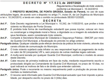 No Diário Oficial do Município desta terça-feira (28), a Prefeitura Municipal de Ponta Grossa decretou a proibição dos trotes violentos entre estudantes no município. No decreto fica proibida toda forma de manifestação estudantil que possa injuriar, colocar em risco ou constranger a integridade moral e física, a dignidade ou a imagem do estudante e/ou seus familiares.