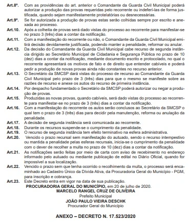 Para quem foi autuado, cabe recurso de primeira instância em face da multa, mediante requerimento escrito e protocolado dirigido ao comandante da Guarda Civil Municipal, no prazo de 10 dias no qual indicará os motivos de fato e de direito que entender procedente, podendo o recorrente neste mesmo requerimento pedir a produção de provas documentais ou testemunhais.