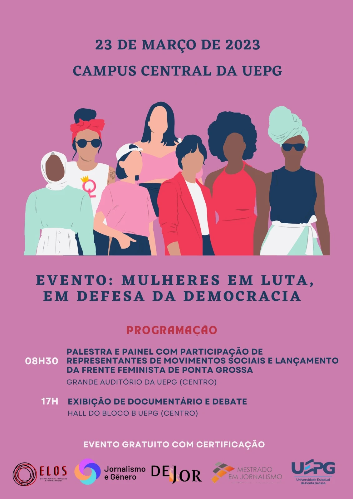 O curso de Jornalismo a Universidade Estadual de Ponta Grossa (UEPG) promove, na próxima quinta-feira (23), o evento ‘Mulheres em luta, em defesa da democracia’. O encontro debate o direito das mulheres e o Dia Internacional da Mulher. A iniciativa é de organização dos projetos Jornalismo e Gênero e Elos – Jornalismo, Direitos Humanos e Formação Cidadã.