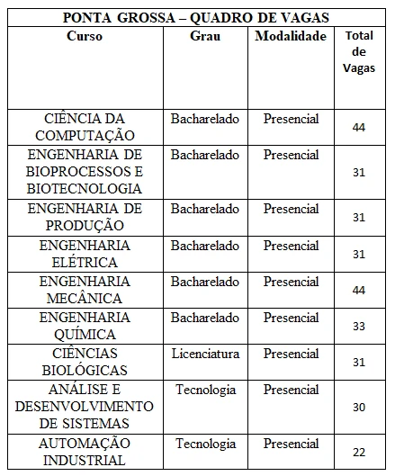 Os cursos de graduação ofertados pela UTFPR são gratuitos. O edital que rege o vestibular foi publicado na quinta-feira, 8, de agosto e prevê o ingresso no primeiro semestre de 2025. Ao todo, são ofertadas 3.934 vagas em 117 cursos dos 13 campi da Universidade. No campus Ponta Grossa, serão ofertadas 297 vagas distribuídas entre 9 cursos diferentes.