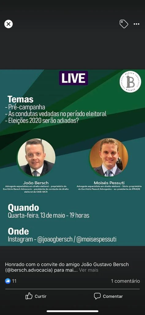 O outro participante da live é João Bersch, advogado especialista em direito eleitoral, proprietário do Escritório Bersch Advocacia e presidente da comissão de direito eleitoral da OAB-MCR (Ordem dos Advogados do Brasil de Marechal Cândido Rondon, PR).