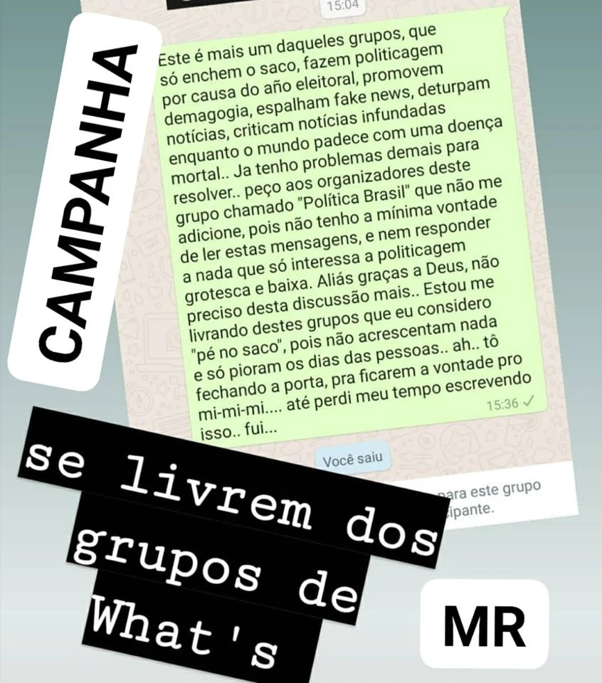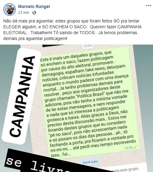Na imagem publicada, Rangel sugeriu uma campanha intitulada 'se livrem dos grupos de what's' e afirmou que muitos destes grupos são voltados para a campanha eleitoral de alguém, que deturpam notícias e espalham fake news.