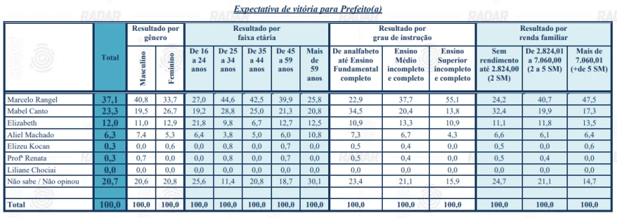 A pesquisa realizada pelo Radar Inteligência foi feita nos dias 8, 9 e 10 de julho de 2024. O estudo, contratado pelo D’Ponta Mídias e Consultoria Ltda/Grupo D’Ponta, entrevistou 600 eleitores de maneira presencial. A margem de erro é de 4,0 pontos percentuais para mais ou para menos e o intervalo de confiança é de 95,5%. A pesquisa está registrada no TRE/PR sob o número PR-08101/2024.