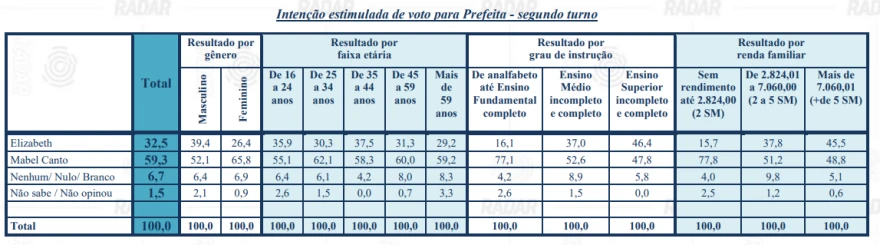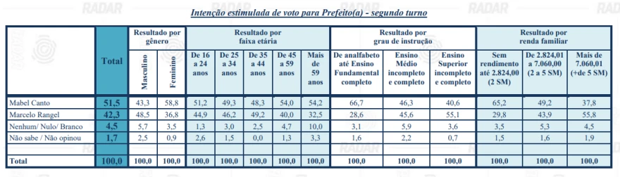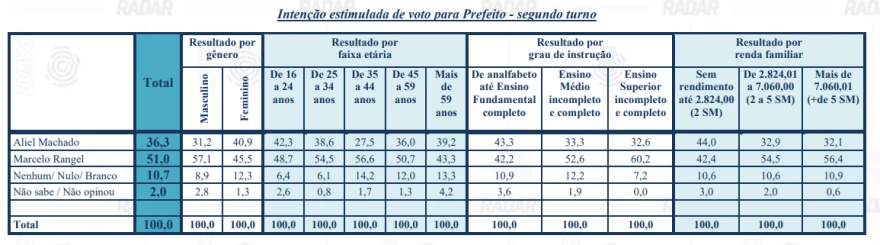 Os eleitores também foram apresentados a cenários de segundo turno entre os pré-candidatos com maior porcentagem de votos. Os resultados envolvendo gênero, faixa etária, grau de instrução e renda familiar podem ser conferidos abaixo: