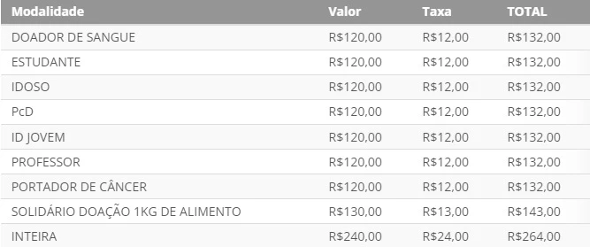 Os valores dos ingressos, de acordo com a organização, são os seguintes: