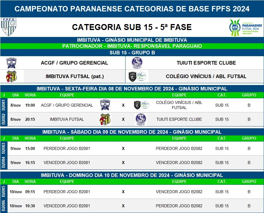 A expectativa, inclusive, é de uma grande etapa no município da região dos Campos Gerais: Tuiuti e Imbituva disputaram o título estadual da categoria na última temporada, com a equipe cascavelense levando a melhor; a repetição do duelo de 2023 fecha a rodada de sexta, a partir das 20h15. No sábado, os perdedores de sexta se enfrentam a partir das 15 horas, enquanto os vencedores duelam a partir das 16h15; já a rodada de domingo fechará o rodízio completo entre os times, com as duas melhores campanhas avançando à fase final. Todas as partidas serão no Ginásio Diogo Emanuel de Almeida.