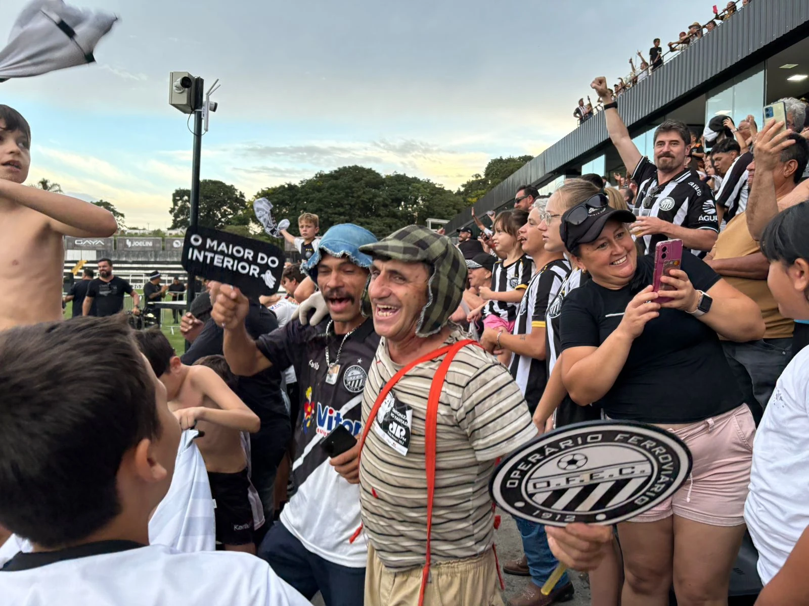 Após a conquista do Operário Ferroviário no Campeonato Paranaense na tarde deste sábado (07), a torcida do Fantasma se dirigiu a Avenida Vicente Machado para comemorar o título. A população ocupa o cruzamento da via com a Rua Augusto Ribas e, meio a cantos e gritos, mostram sua paixão ao OFEC. Entre eles, a equipe do D'Ponta News encontrou dois personagens queridos do público entre os torcedores: "Chaves" e "Seu Madruga"