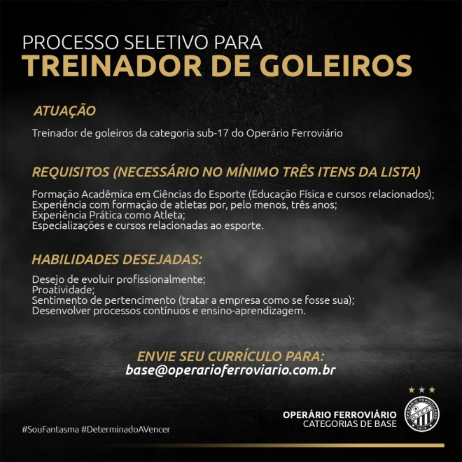 O Operário anunciou no fim da tarde desta quarta-feira (8) que está com processo seletivo para a função de treinador de goleiros. O profissional irá atuar na categoria sub-17 da equipe. Confira abaixo os requisitos e como participar: