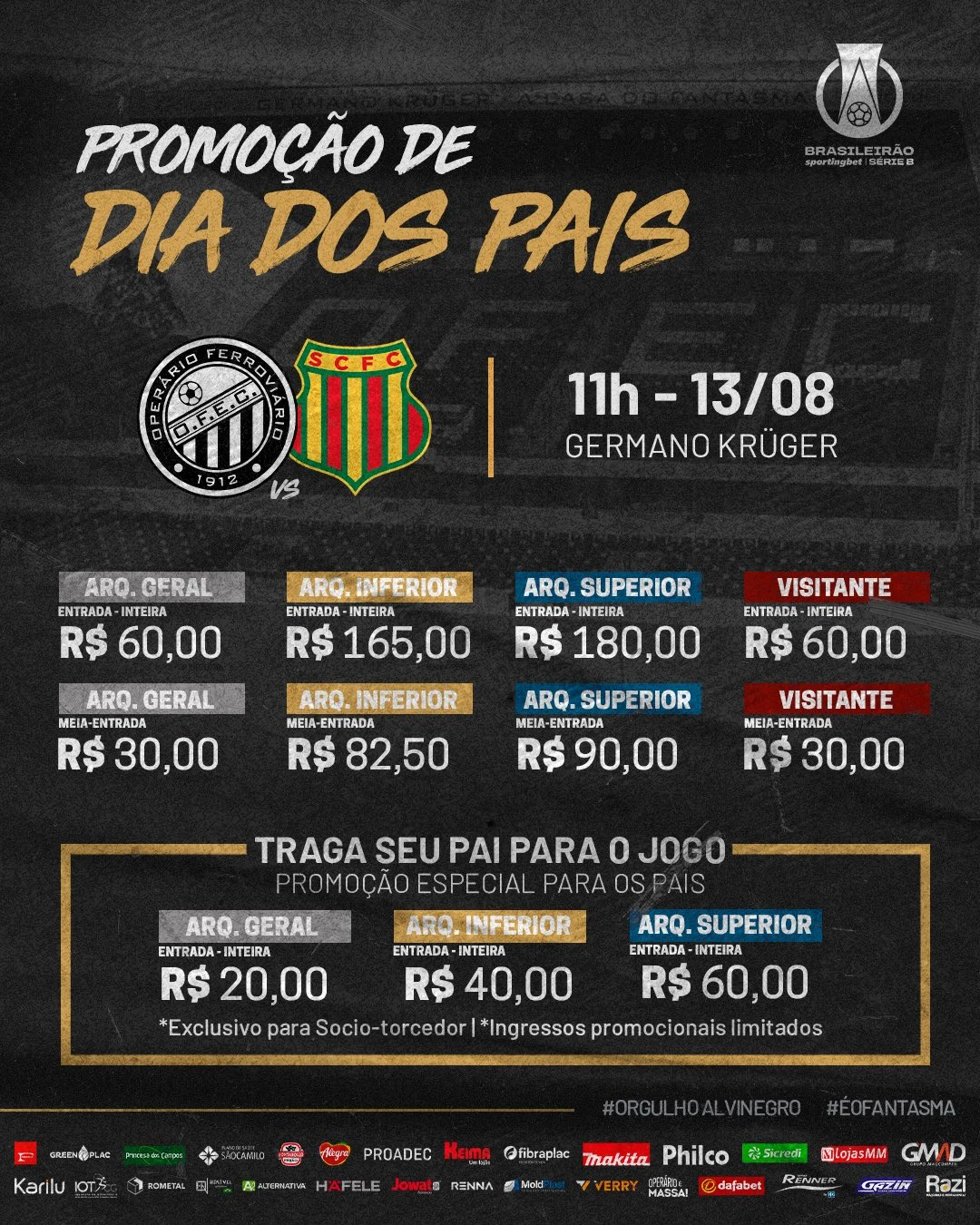 O Alvinegro mantém os valores de R$ 60 inteira e R$ 30 meia nos ingressos equivalentes ao Setor Prata e também faz um pedido para que o Sócio-Torcedor traga seu pai ao jogo.