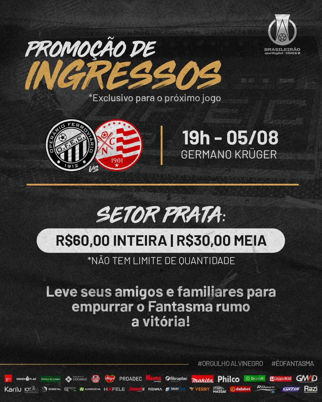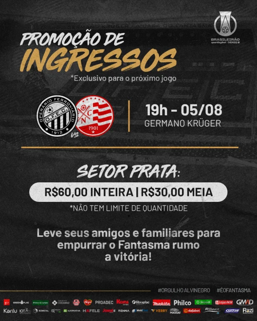 Nesta terça-feira (02), iniciou a venda de ingressos para a partida válida pela 22ª rodada do Campeonato Brasileiro da Série B 2022. O duelo entre Operário e Náutico será no dia 05/08, às 19h, no Estádio Germano Krüger.