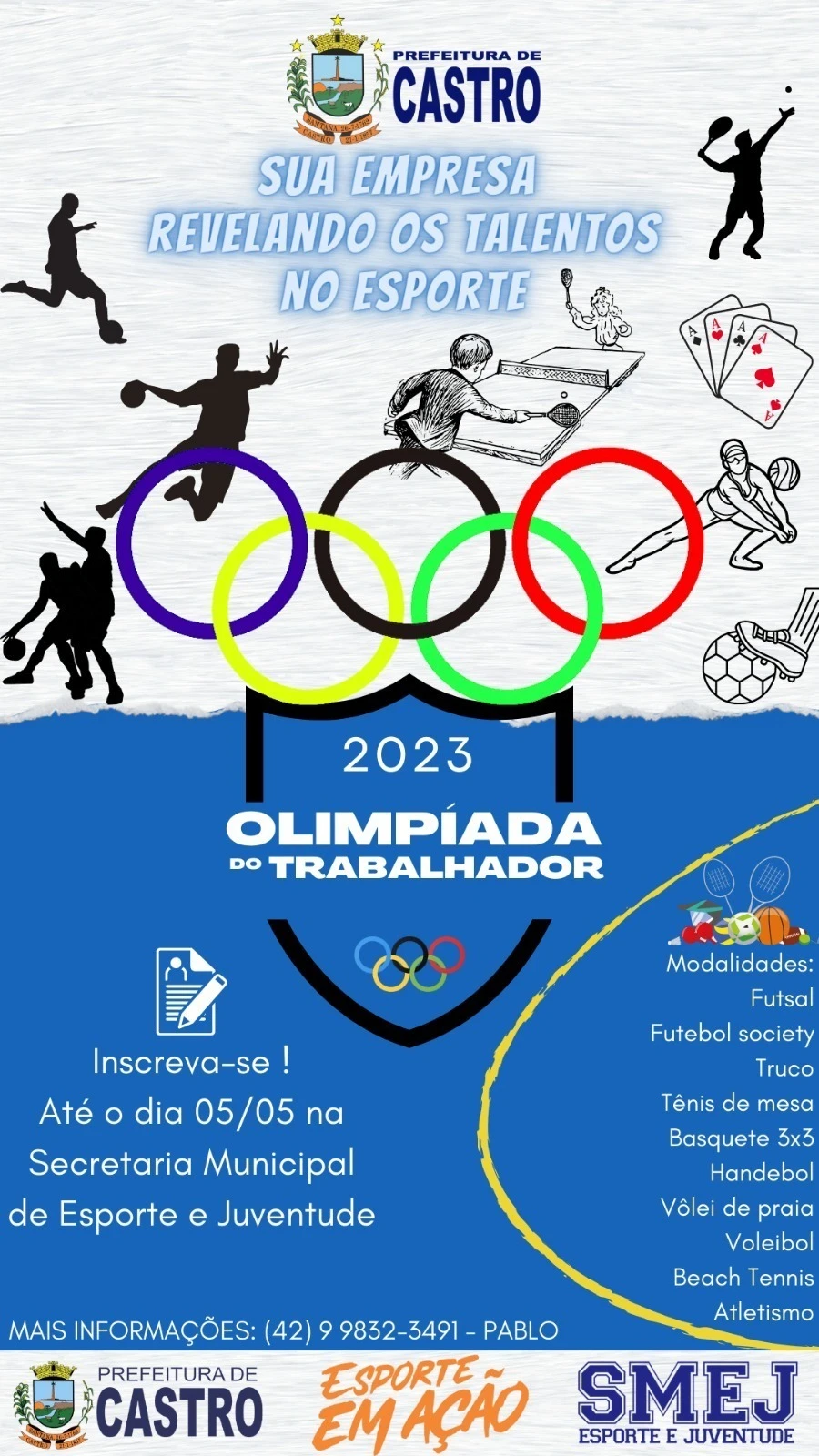 Em 2023 a Secretaria Municipal de Esporte e Juventude de Castro irá promover a 5ª edição da Olimpíada do Trabalhador, com a participação de colaboradores de empresas castrenses. A ação será realizada em comemoração ao Dia do Trabalhador, ao longo do mês de maio. Empresas interessadas podem se inscrever até no dia 5 de maio, na Secretaria de Esporte do município.