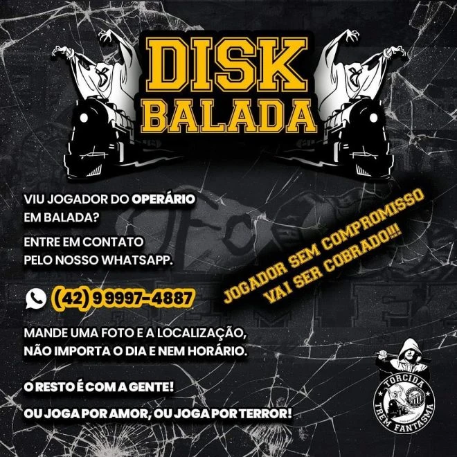 Em publicação nas redes sociais, a torcida organizada do Operário, a Trem Fantasma, lançou uma 'campanha' intitulada 'Disk Balada'. Segundo a postagem, o objetivo é que os torcedores informem caso vejam os jogadores do time em baladas na cidade. "Jogador sem compromisso vai ser cobrado", diz a torcida.