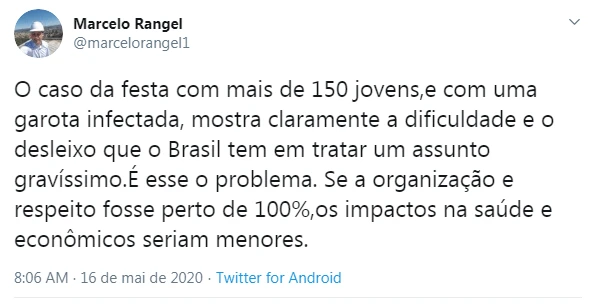 "O caso da festa com mais de 150 jovens,e com uma garota infectada, mostra claramente a dificuldade e o desleixo que o Brasil tem em tratar um assunto gravíssimo.É esse o problema. Se a organização e respeito fosse perto de 100%,os impactos na saúde e econômicos seriam menores", disse o prefeito.