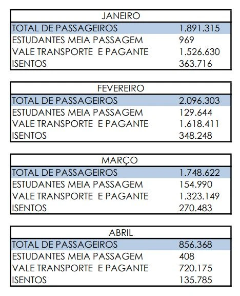 De acordo com os dados da Autarquia Municipal de Trânsito e Transportes (AMTT), os ônibus da Viação Campos Gerais (VCG) transportaram, de Janeiro a Abril deste ano, 6.592.608 passageiros, dentre eles pagantes em dinheiro, vale-transporte, meia passagem e isentos de pagamento. Fevereiro registrou o maior índice do ano até o momento, contabilizando 2.096.303 passageiros. Em abril, com o comércio completamente fechado, 856.368 pessoas passaram pelo transporte coletivo. O pior número da história de Ponta Grossa.