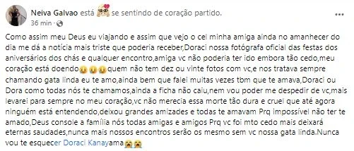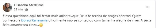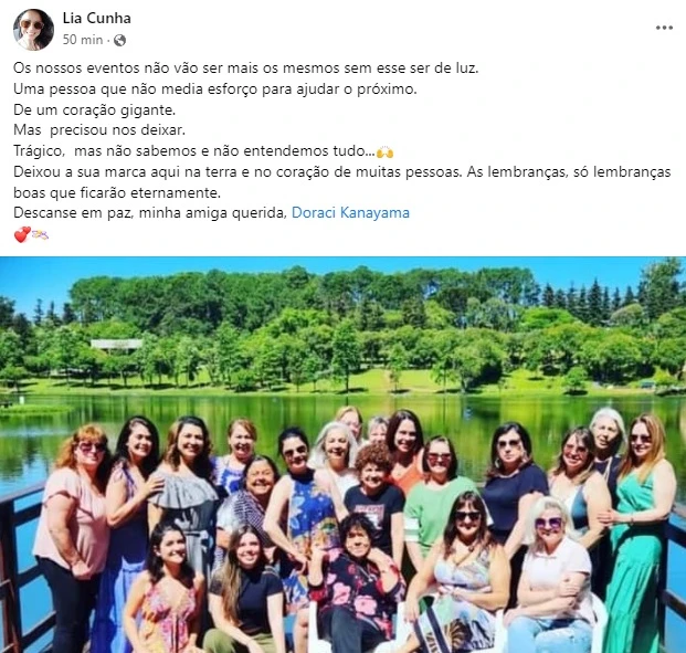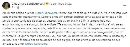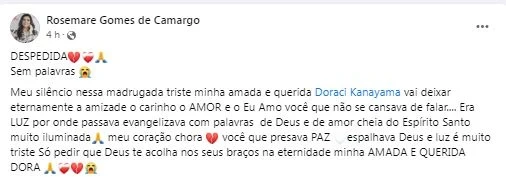 Doraci Kanayama. Eu não acredito que uma mulher como você fosse embora dessa maneira amiga. Como você sempre falava, amiga, minha linda gata. Te amo amiga por toda minha vida. Você vai ficar Eternamente no nosso coração".